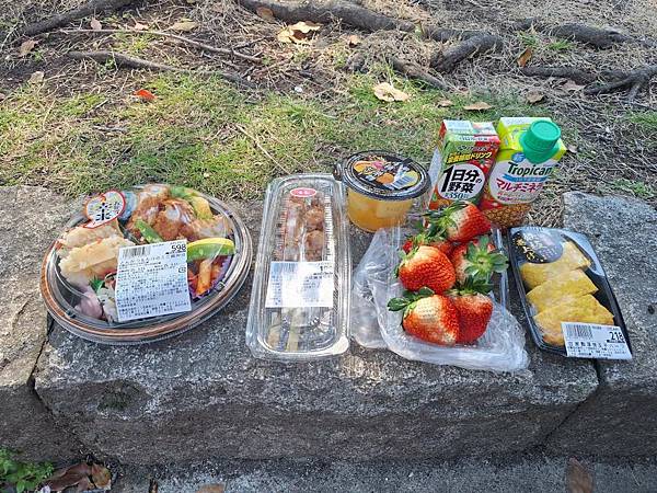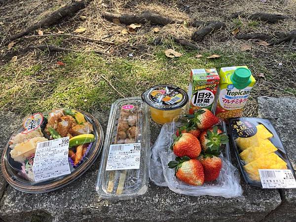 我們買了便當、燒烤、玉子燒、草莓、果凍、飲料等,相當豐盛,全部共1975日幣(約435台幣)。