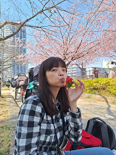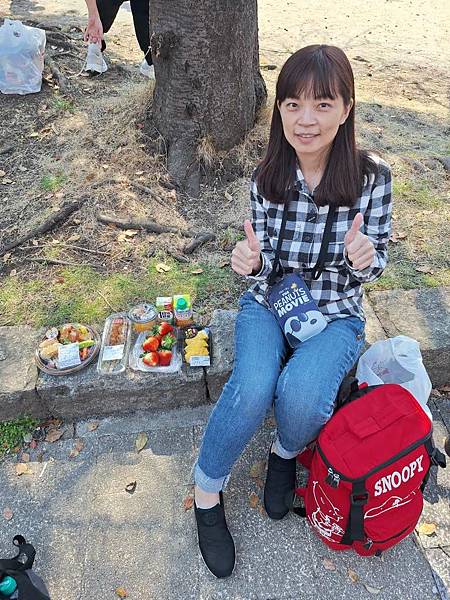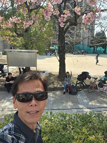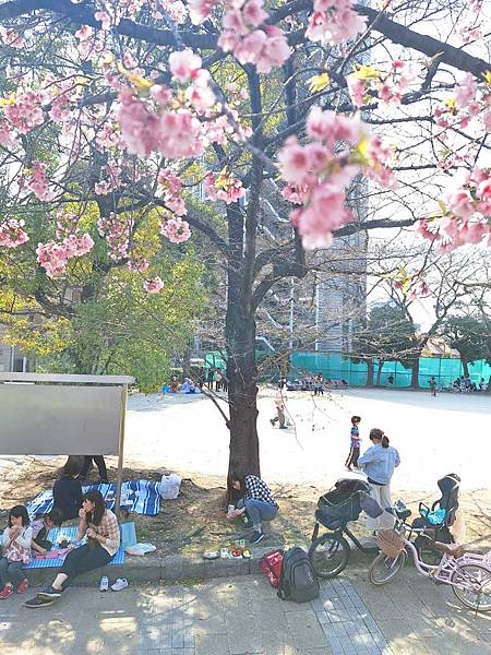 比爸到有櫻花的地方拍我們野餐的樣子,旁邊的日本人都準備了野餐墊,我們因為很臨時,所以只能克難的在石階上野餐。
