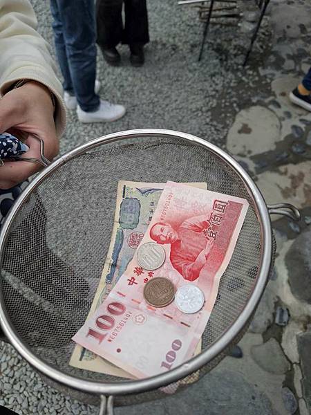 開始洗錢囉,我直接把鐵網上的錢放入池中,而我身後的阿伯則是將鐵網放在竹子上,用勺子舀水洗錢,這樣的方式好像比較正確。
