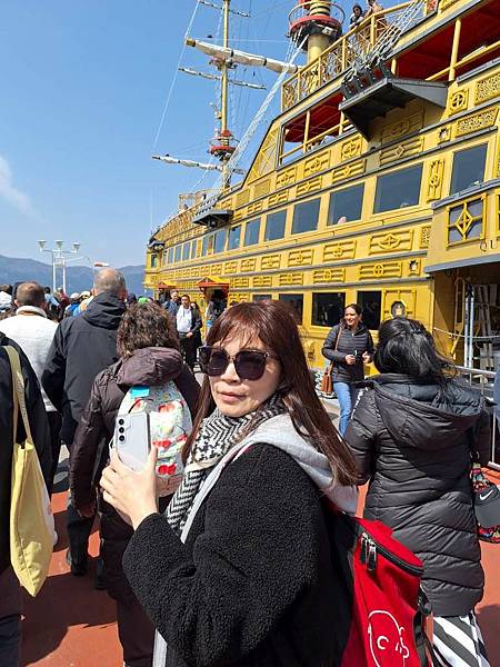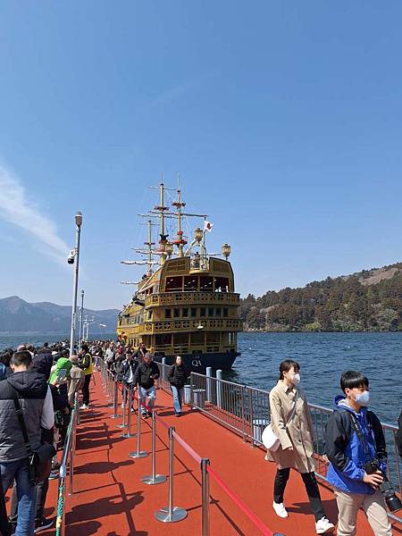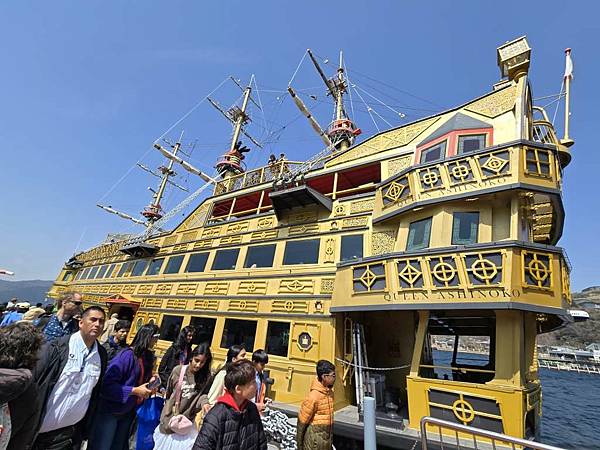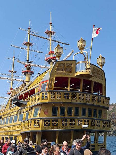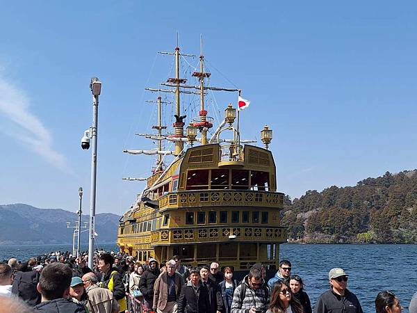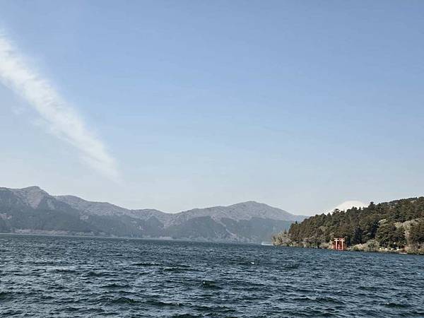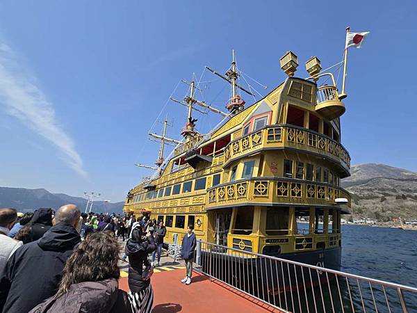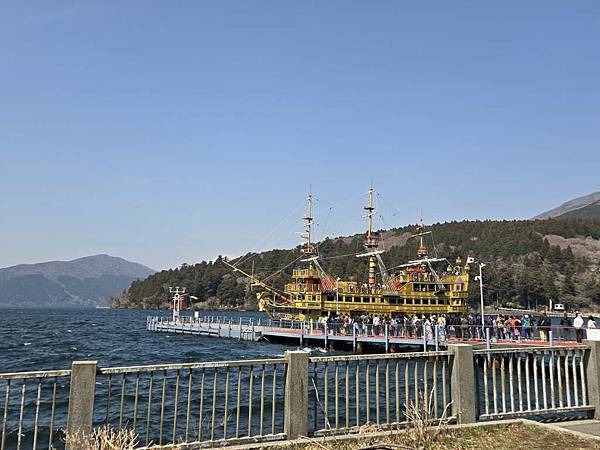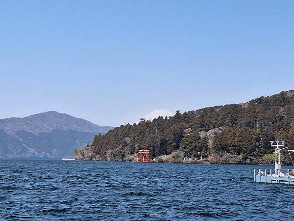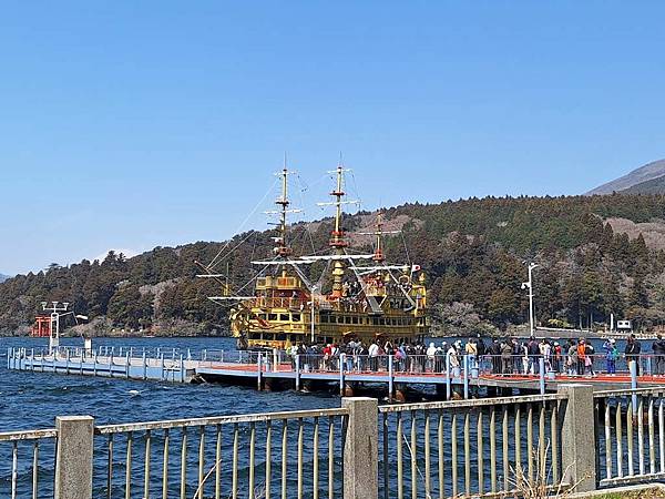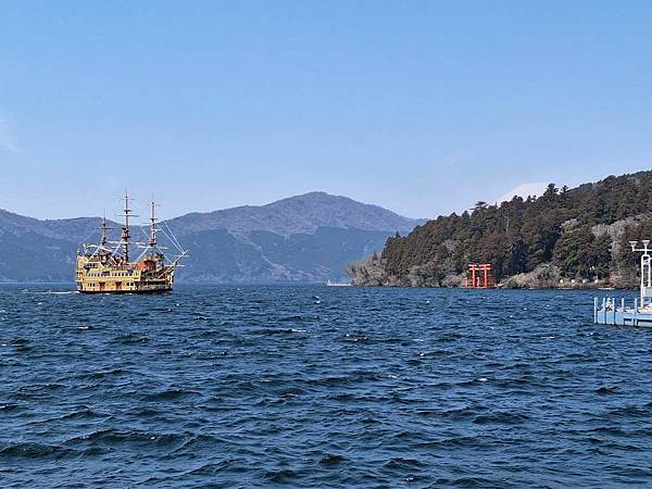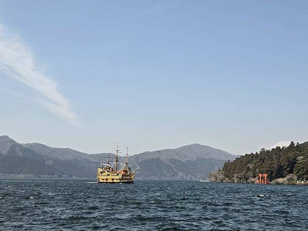 海賊船、水上鳥居及後面的富士山山頂同框。