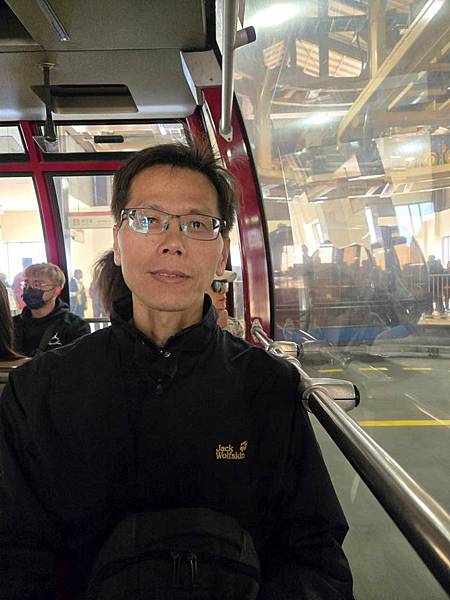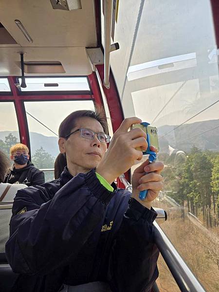 比爸正在拍對面纜車,裏頭坐在西方人。