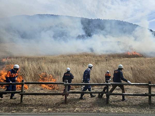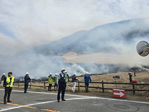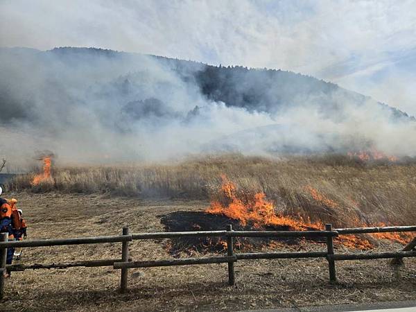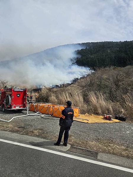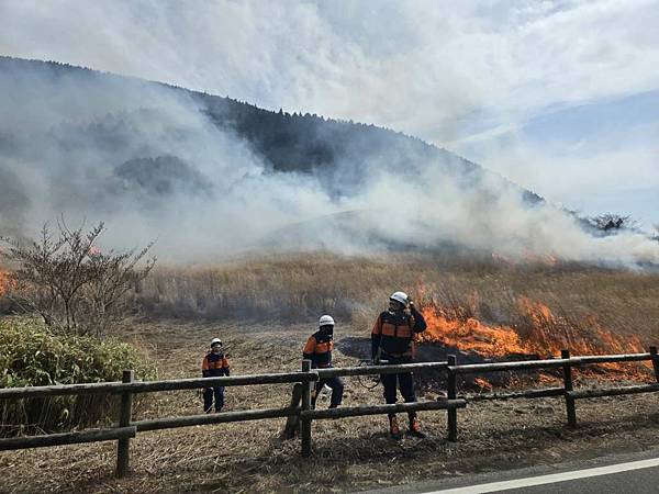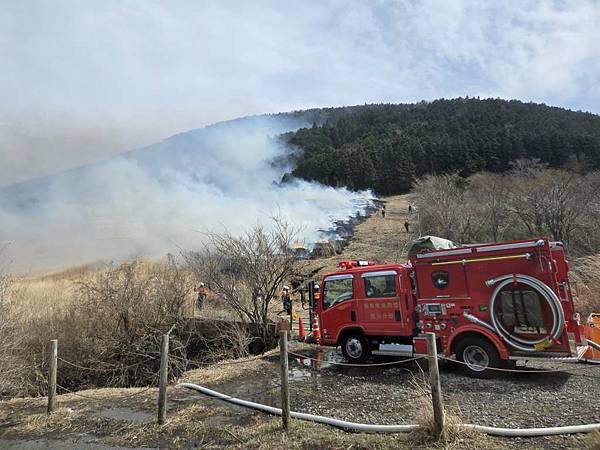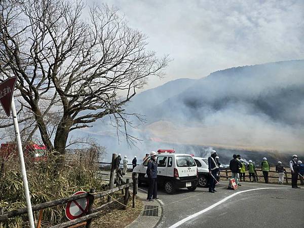 剛離開大涌谷,我們就遇到火燒山,一開始還以為消防車要來滅火,仔細一看有弄出隔離帶,且消防車沒有滅火,只是在旁邊待命,導遊說是因為野草太多,所以先將它燒掉,避免之後真的發生火災。