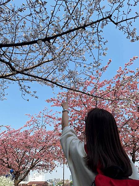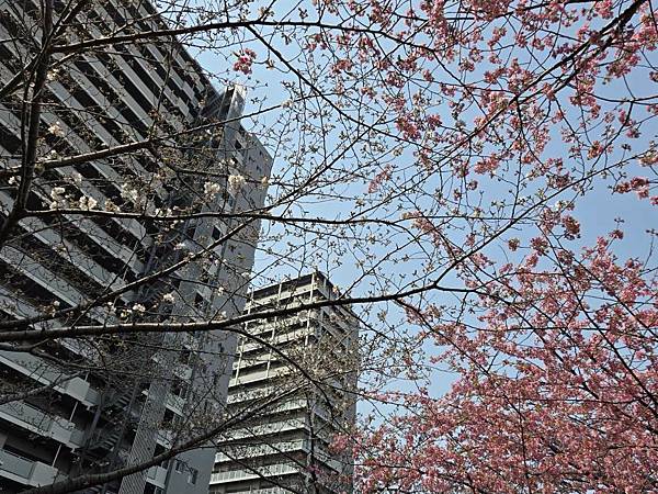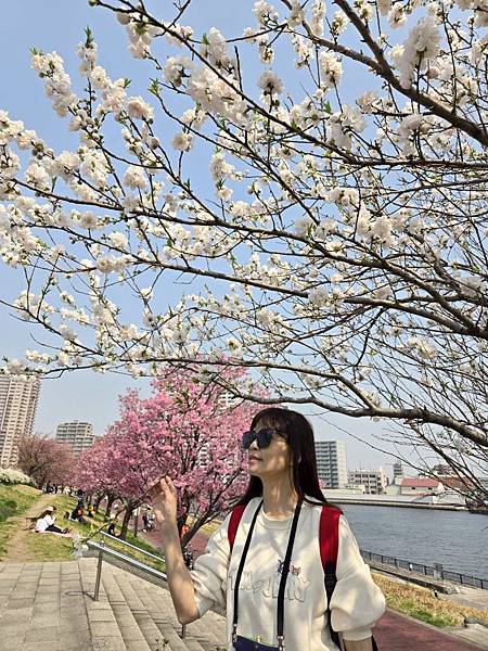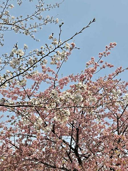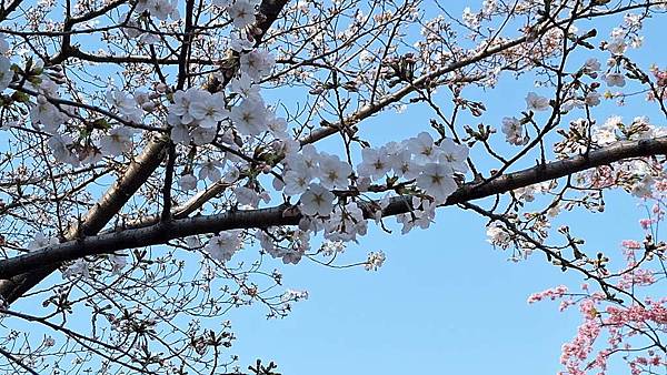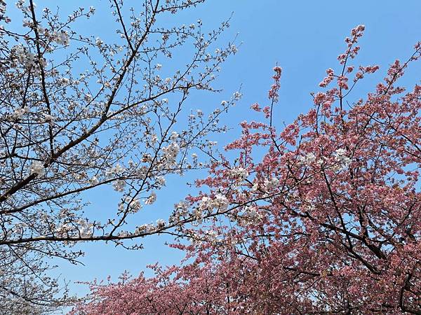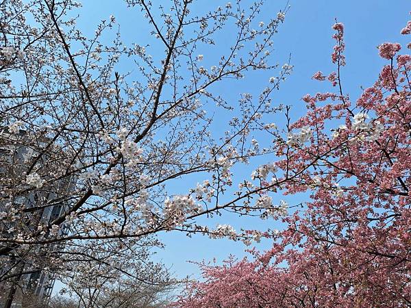 白色的染井吉野櫻與粉紅色的大寒櫻交錯。