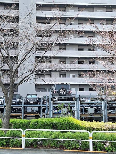 對面社區停車場採露天機械塔,第一次看到這種型式的。