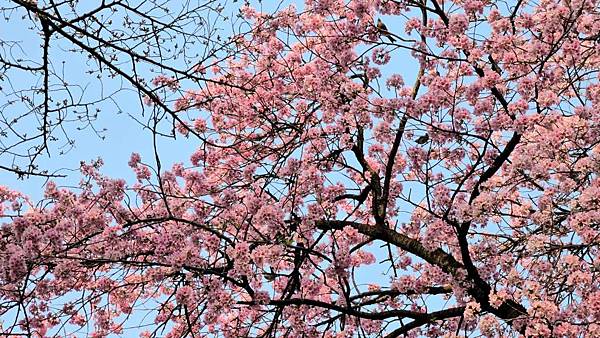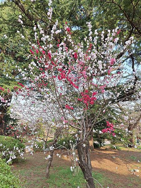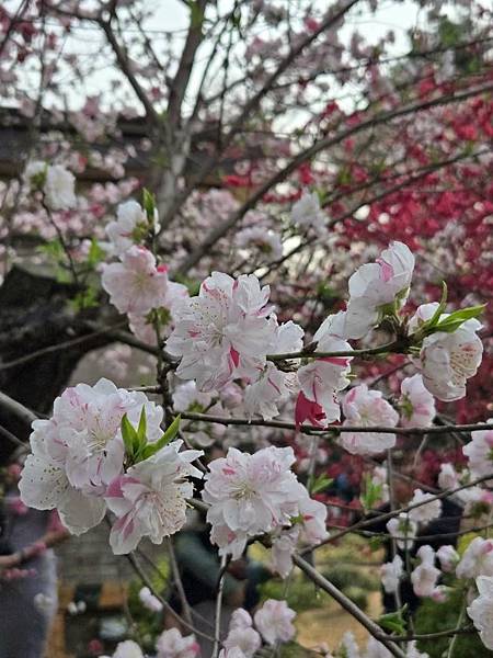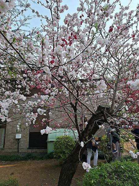 這株櫻花利用嫁接技術,同時有紅、粉、白不同顏色的花。