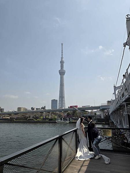 有對新人以晴空塔為背景拍婚紗照。