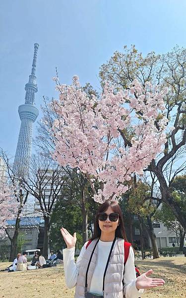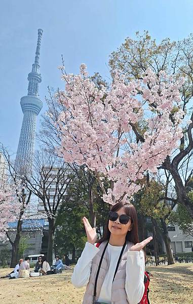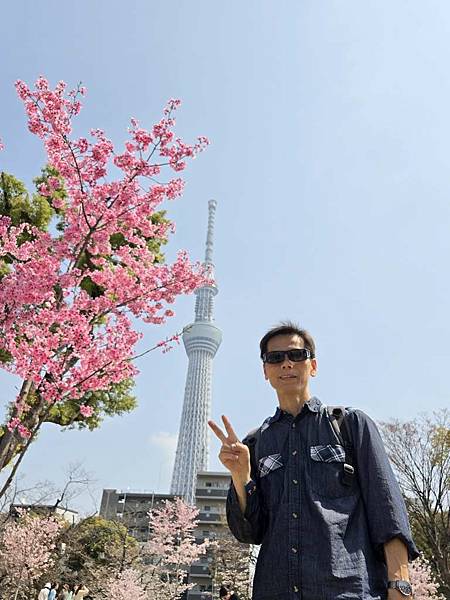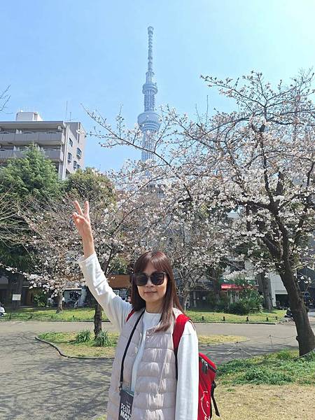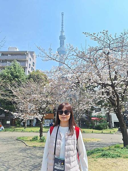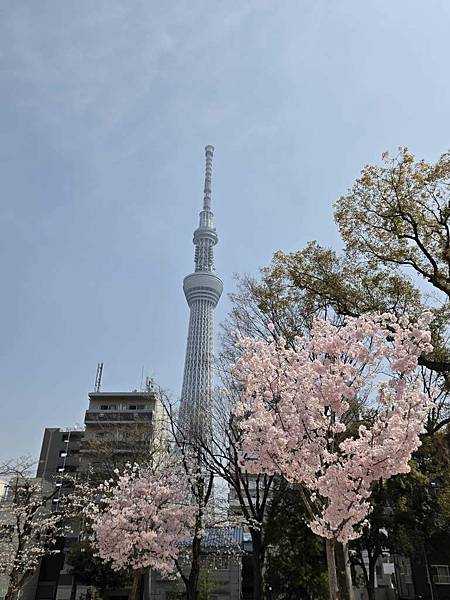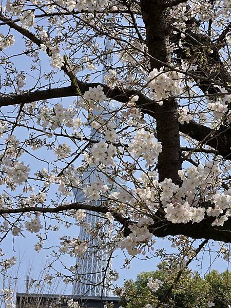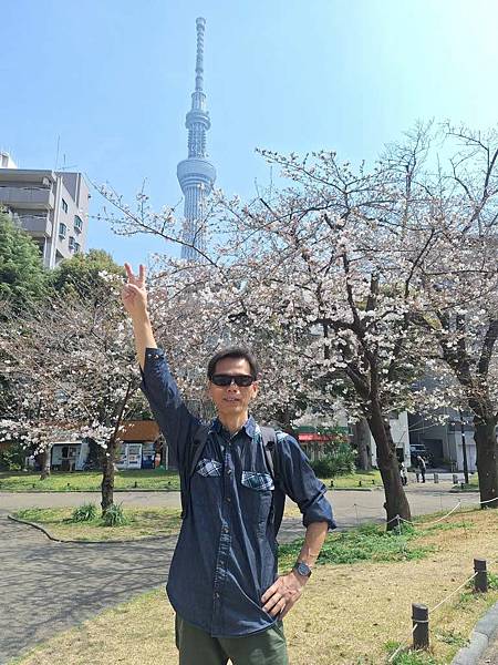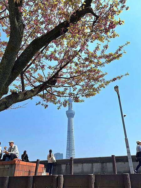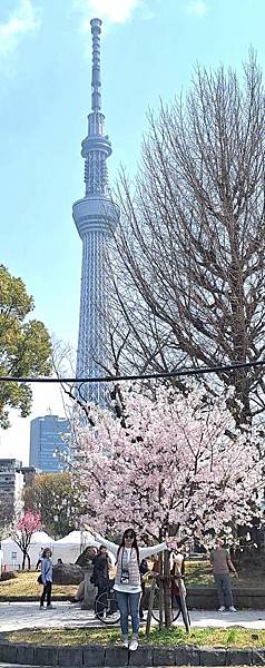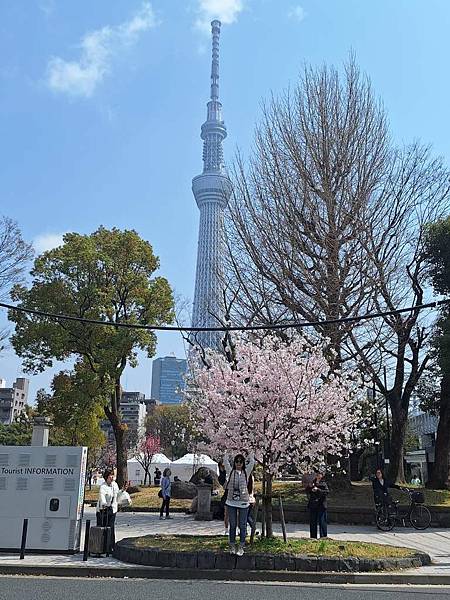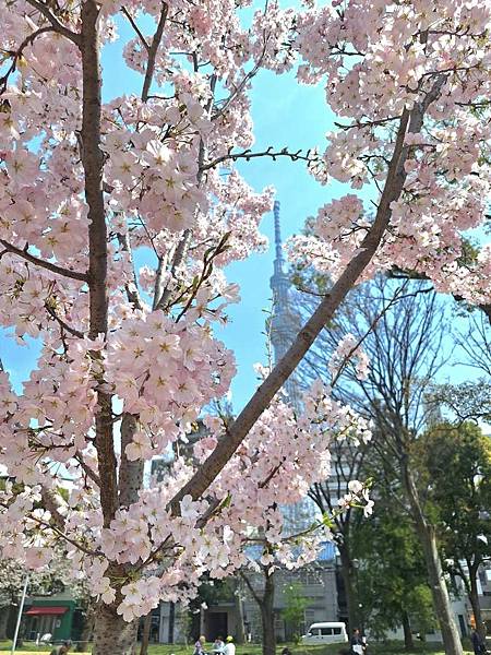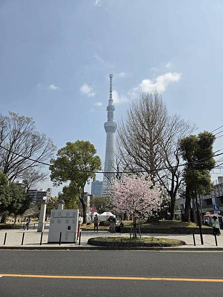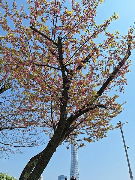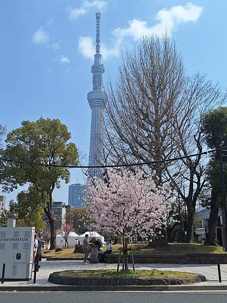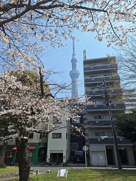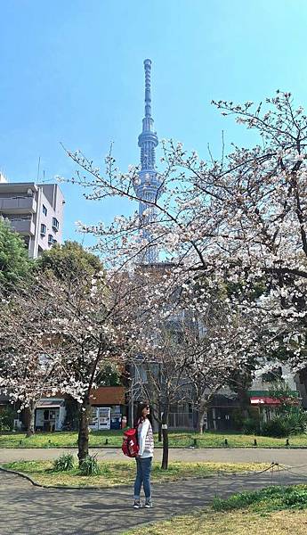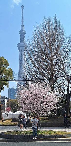 馬路對面就是隅田公園,路邊就有一株美麗的櫻花輝映著晴空塔。