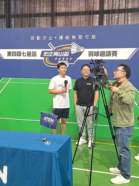 表演賽結束後,李洋到2樓與宏正科技老闆合影並接受媒體訪問。