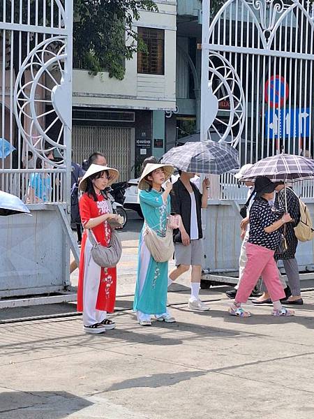 繞回正面了,剛好有2個日本遊客穿著越南傳統服飾-奧黛,並且帶著斗笠。