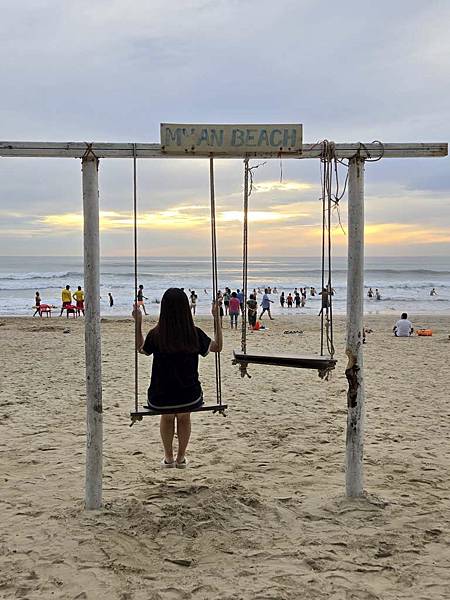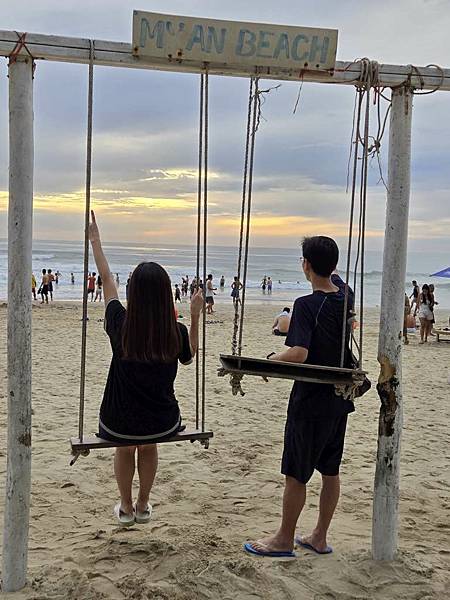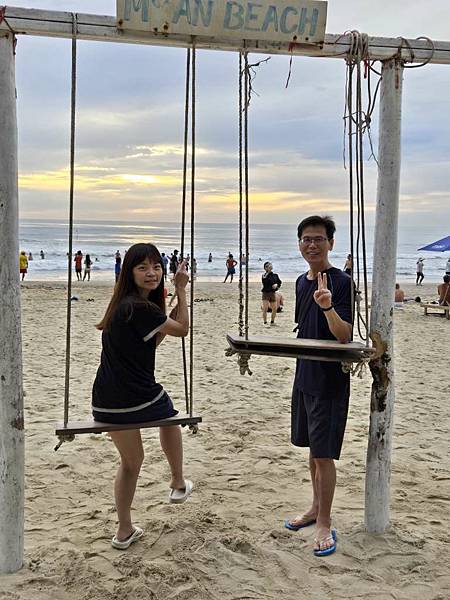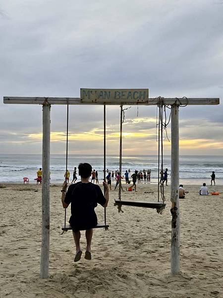 沙灘上架著一座盪鞦韆,右邊那個實在太高,連比爸都無法坐上去。