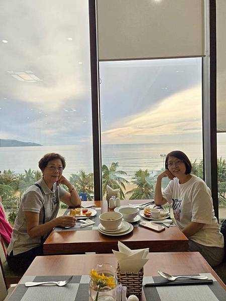 媽媽跟大妹窗邊海灘美景享用早餐。